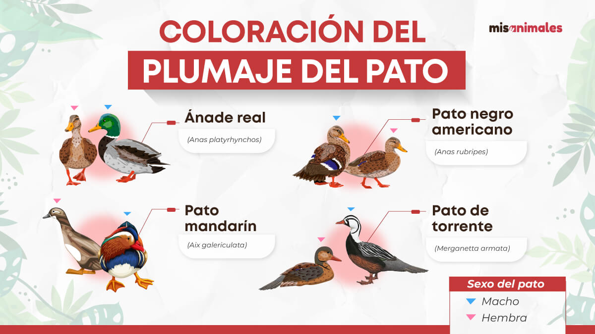 Una de las formas de reconocer si un pato es macho o hembra es por la coloración que presentan en su plumaje. Veamos a detalle este aspecto en los siguientes ejemplos: