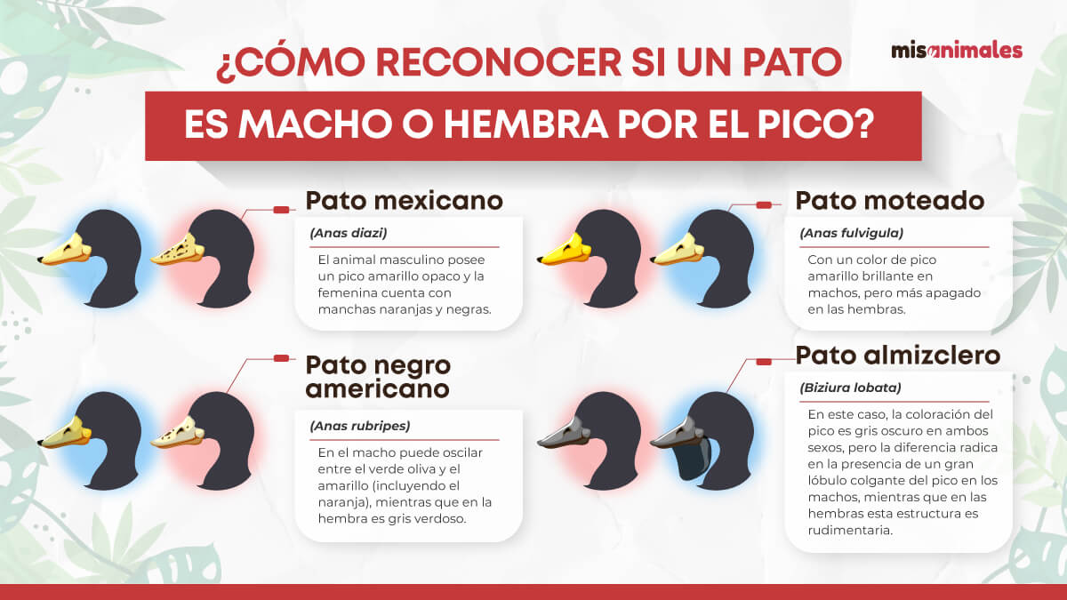 Además de las diferencias de coloración en los patos machos y hembras, también encontramos dimorfismo sexual en los tonos de sus picos. Veamos algunos casos puntuales: