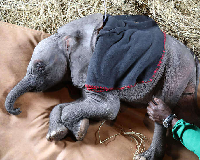 Cuidador duerme junto a un elefante huérfano para consolarlo y transmitirle calma