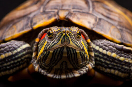 El nombre de tortuga de orejas rojas deriva de unas rayas horizontales de color rojo brillante que se ubican a cada lado de su cabeza, porque no tienen orejas u oídos externos en sí.