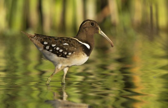 Con sus largas patas y su pico curvo y fino, esta ave es inconfundible, la becacina pintada o aguatero americano. Cualquiera que visite los humedales de Argentina, Paraguay, Brasil, Uruguay o Chile podría avistar las motas blancas de sus alas dentro del agua, donde acostumbran a buscar comida.